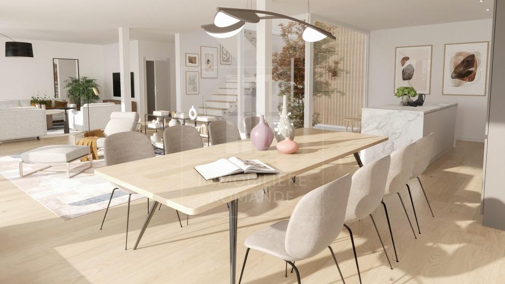 Conçue par un cabinet d’architectes genevois renommé, cette maison se distingue par ses lignes épurées et l'harmonie de ses choix esthétiques et architecturaux. L'atrium, élément central de la conception, traverse les étages et inonde les intérieurs d’une lumière naturelle, sublimant ainsi les espaces de vie.