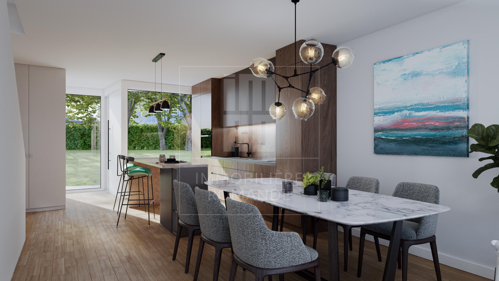 LA SITUATIONDécouvrez ce prestigieux ensemble de 4 maisons de ville parfaitement intégrées à leur environnement paisible. Blottie dans le quartier prisé de Vésenaz, la résidence Catena offre un accès aisé aux commodités du quotidien.Connue pour son harmonieuse combinaison entre vie urbaine et nature environnante, Vésenaz offre un cadre de vie idyllique sur la Rive Gauche.Aux portes du centre-ville, la commune s’étend sur une vaste zone agricole invitant à de paisibles balades, ainsi que sur plusieurs réserves naturelles à découvrir en famille. Les rives du lac et les plages aménagées sont également rapidement rejointes.Parfaitement adaptée à la vie de famille, la commune propose deux crèches, des écoles primaires, un cycle d’orientation et deux écoles privées. Plusieurs associations et clubs sportifs sont actifs sur la commune (tennis, football, judo, karaté, danse, etc.).De grandes enseignes telles que Manor, Coop et Migros agrémentent le centre du village aux côtés de divers centres médicaux, restaurants, cafés, ainsi qu’une pléthore de commerces enrichissant la vie locale (coiffeurs, cavistes, quincailleries, garages, salles de sport, pharmacies, banques, bureaux de poste, etc.).Plusieurs lignes de transports publics desservent la commune dont les lignes E et G.LE PROJETA mi-chemin entre campagne et centre-ville, Catena offre un environnement serein allié aux avantages de la vie citadine. Vous bénéficiez ainsi d’une qualité de vie unique.Niché à proximité immédiate de zones agricoles, Catena présente 4 townhouses à l’esthétique contemporaine et épurée, harmonieusement intégrées dans leur écrin de verdure en bordure d’un cordon boisé.Fonctionnels, les logements ont été pensés modulables selon les besoins de l’acquéreur, avec des typologies traversantes optimisant la luminosité naturelle.Les maisons construites selon les normes THPE (Très Haute Performance Energétique), garantissent une efficacité énergétique exceptionnelle assurant un confort optimal tout au long de l’année. Des panneaux photovoltaïques en toiture assurent la production d’électricité.Un parking souterrain sécurisé assure la sécurité tout en préservant l’esthétique des espaces extérieurs. Une place de parking visiteurs, ainsi qu’une place moto sont à disposition de la résidence.LES TOWNHOUSESD’une surface brute allant de 114 à 158 m2, les townhouses se déploient sur 3 étages + sous-sol et bénéficient d’une orientation Nord-Est / Sud-Ouest.Le rez-de-chaussée accueille les espaces de vie, prolongés par une terrasse et un jardin privatif. L’entrée avec vestiaire et toilettes visiteurs mène à une belle cuisine ouverte avec espace salle à manger. En continuité, le salon s’ouvre sur une agréable terrasse propice à la détente.Le premier étage offre une flexibilité d’aménagement selon vos besoins, avec deux configurations déjà pensées par nos soins. Il comprend 2 chambres, l’une donnant accès à un balcon et l’autre à une loggia. L’étage offre également un espace polyvalent idéal pour l’aménagement d’un espace bureau. Le niveau est complété par une salle de bains et un dressing.En attique, vous trouverez une chambre parentale avec salle de douche en suite. Ce niveau donne accès à deux magnifiques terrasses avec vue imprenable sur le Jura.Chaque maison bénéficie de deux places de parking intérieures. Un espace privatif avec cave et buanderie est aménagé pour chaque townhouse et permet l’accès direct au logement depuis le garage souterrain.